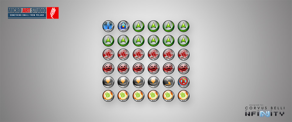 A set of 36, 15mm tokens made of a transparent 3mm acrylic. The high quality print is protected from scratching by a layer of white foil. The colours of the tokens may vary from the ones presented. Designed by Corvus Belli