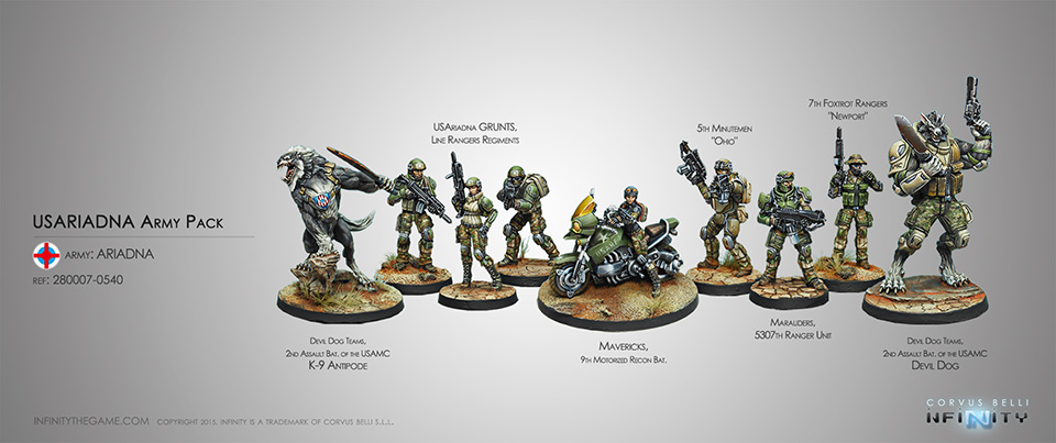 A box containing 9 miniatures belonging to an Ariadnan Sectorial Army, an introductory ruleset, scenery, dice and everything you need to start collecting Infinity or just to complete your collection! Apart of that, the USAriadna Army Pack is the way to be introduced in the Infinity 3rd Edition, the largely awaited revision of this game, as it includes a full color 68 page rulebook (English/Spanish) containing the Quick Start Rules to learn to play Infinity, making easy to understand the game core mechanics. However, veteran players will also find the completely new USAriadna Ranger Force Sectorial Army list, 2 ITS army lists and 3 totally new and ready to play scenarios. In this book you will also find the background and troop profiles of all the units of the Battle Pack, being 3 of them totally new! There is also a brief guide to the Infinity universe and advices about how to deep more on it. The USAriadna Army Pack contains a totally new USAriadna Starter Pack, a Devil Dogs Team box, containing a Dog-Warrior type trooper and also an Antipode too, composing a new USAriadna unit! And it also includes 1 exclusive miniature, a Maverick with a Boarding Shotgun, a female biker only available in this Army Pack. A total amount of 9 highly detailed metal miniatures! And to fulfill the game experience, the Battle Pack includes ready-to-play cardboard scenery (4 buildings and 6 containers), a game mat, 3 Ariadnan twenty-sided dice, and also cardboard Markers, Templates and a measurement ruler. Everything you need to start playing!